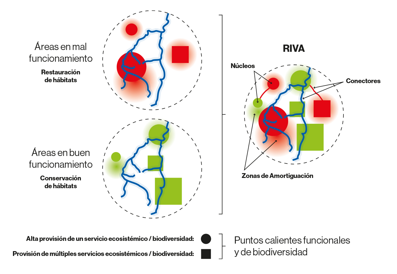 La RIVA integra diversos procesos que ocurren en la cuenca, conectando ecosistemas mediante áreas núcleo, conectores y zonas de amortiguación.